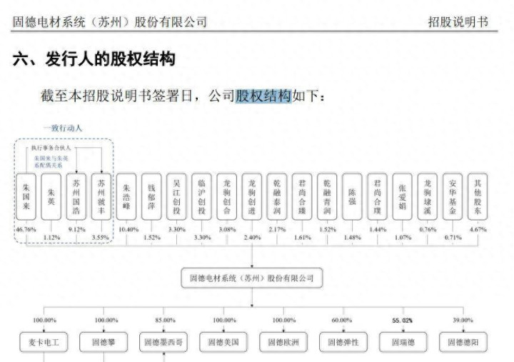 朱国来表决权超六成,年内被出具警示函。固德电材控股股东、实际控制人是朱国来,直接持股比例46.76%,并通过苏州国浩、苏州虢丰分别控制9.12%、3.55%的表决权,其一致行动人朱英持股比例为1.12%,即朱国来及其一致行动人合计控制公司60.55%的表决权。